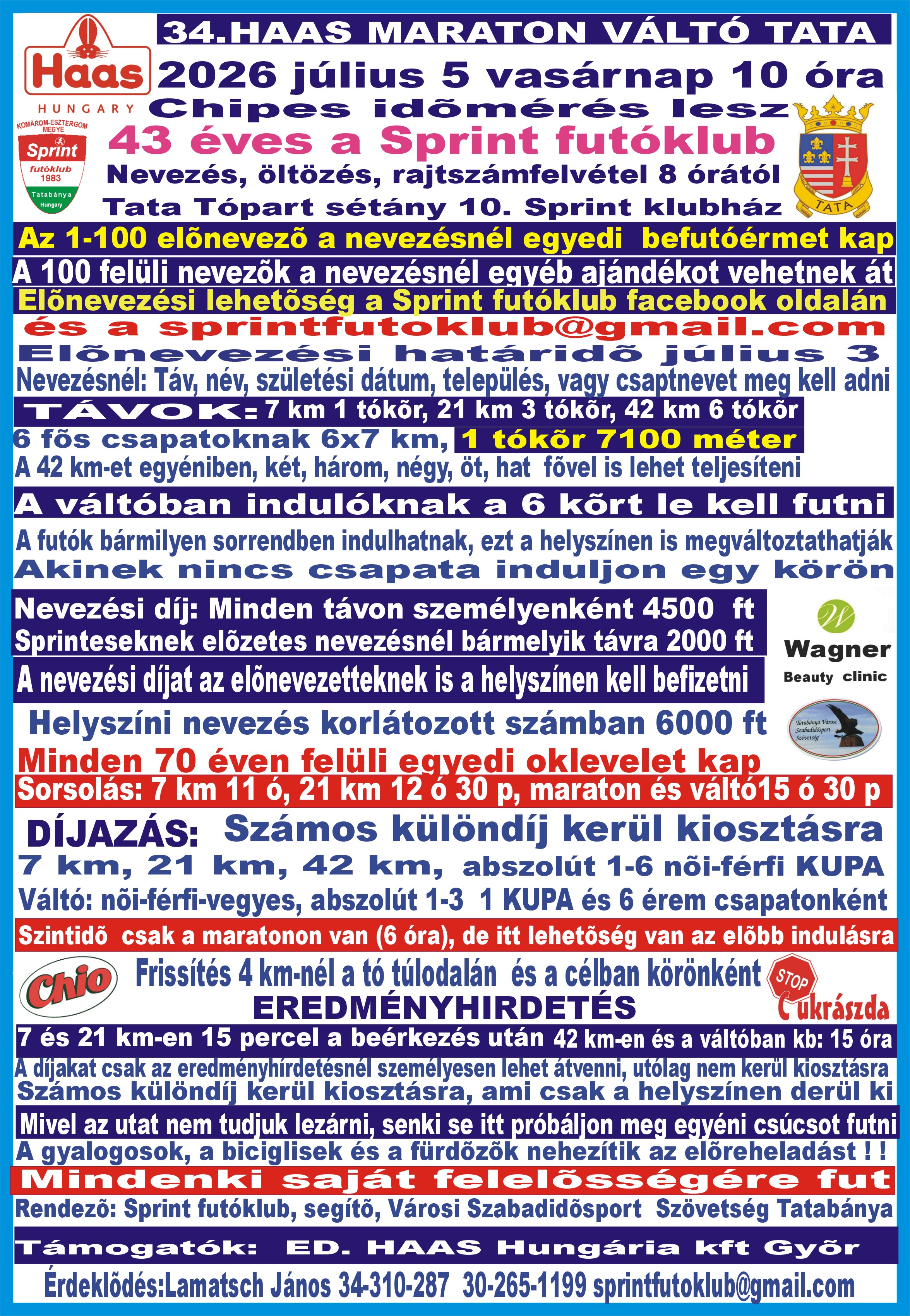 Már.22.vas. TELEKOM VIVICITTÁ FUTÁS - Margitsziget / Víztorony 10km. eredmények Már.22.vas. TELEKOM VIVICITTÁ FÉLMARATON - Víztorony 21km. eredmények Már.22.vas. FIGHTERS RUN - Veszprém ~ terep- és TEREPAKADÁLYFUTÁS 10kutyás-5-10km. eredmények 13. hét Már.28.szo. EGED-FUTÁS - Eger, Érsekkert - R: Nagy Sport Egyesület 13,4km. eredmények Már.28.szo. GERECSE TAVASZI TEREPFUTÁS - Baj - R: TTT HSE 1,5-7,5-15-26km. nevezések! Már.28.szo. GYŐRI ÖRÖMFUTÁS - Győr Püspökerdő - facebook - R: Uni Pro Sport 5-10km. nem listás Már.28.szo. SPORTRÉGIÓ FÉLMARATON - Veszprém, Megyeház tér 0,5-1,3-2,7-4-7-14-21km. eredmények Már.28.szo. TÖRÖKBÁLINTI HENDIKEP - erdei verseny - Törökbálint, Dióskert 5,3km. eredmények Már.29.vas. DEBRECEN MARATON 2026 - Debrecen Hall - facebook 1,7-5-10-21,1-42,2km. eredmények Már.29.vas. DUNAPARTI FUTÓPARTI - Esztergom, kerékpárút - R: Futóművek 4-10km. eredmények Már.29.vas. IPOLY MARATON - Szob, Köztársaság tér - R: Proathlon 2-8-15-21-42km. eredmények Már.29.vas. KIS-DUNA MARATON - Ráckeve, Szent István tér 22. - facebook 10-21-42km. eredmények Már.29.vas. NN CITY RUN - Budapest, Várkert Bazár 5-11-21km. eredmények